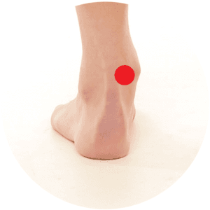 Lage – Beide Punkte liegen auf Höhe des Sprunggelenks, zwischen dem äußeren/inneren Knöchel und der Achillessehne. Beide Punkte können mit Daumen und Zeigefinger ergriffen und massiert werden.